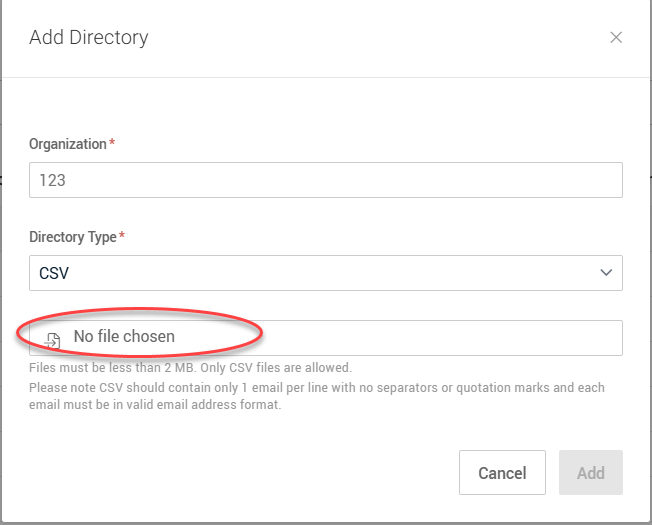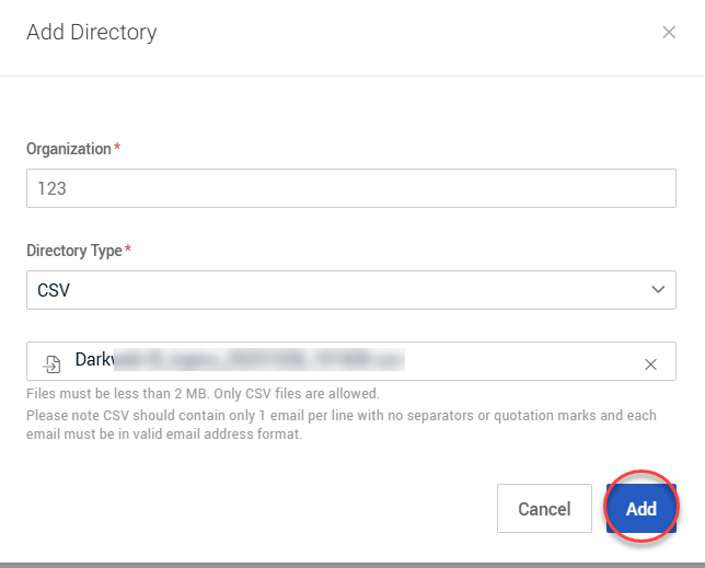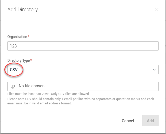 4. In the Add Directory modal, CSV is automatically selected in the Directory Type list.