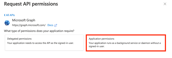 11. Click Application permissions (the app needs to act on its own behalf, not as a signed-in user).