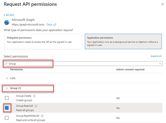 12. In the Select permissions search box, enter Group. Click the Group drop-down menu and select the Group.Read.All check box. This permission allows the application to read all group properties and memberships in your organization.