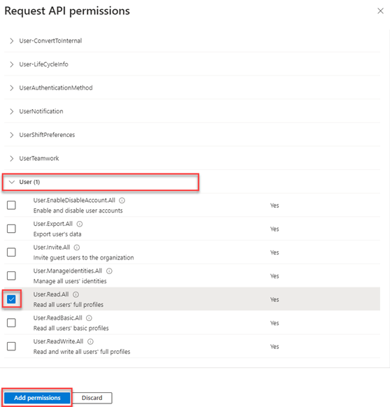 13. Scroll down to User, click the drop-down menu and select User.Read.All. This ensures the application can read the full user profiles necessary for monitoring. Click Add permissions.