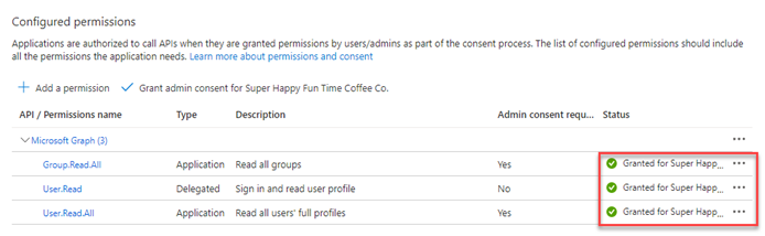 15. In the confirmation modal, click Yes. The Status column in the Configured permissions will update to indicate the permissions have been successfully granted.