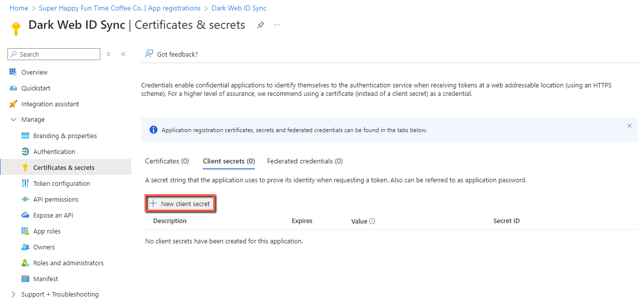 17. Click + New client secret. This secret is needed to authenticate with Dark Web ID.