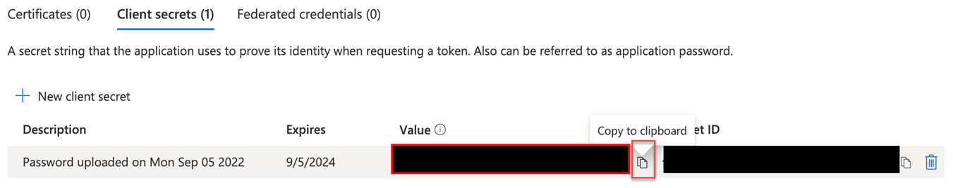 19. Immediately copy the Value field from the client secret you just created. This is the Client Secret credential needed in the next procedure.