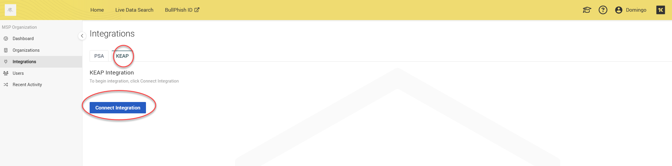 KEAP tab: Click this tab and then select Connect Integration to initiate the connection process.