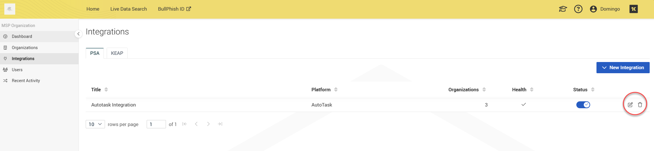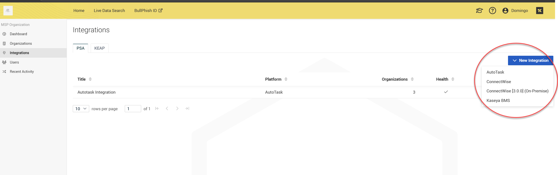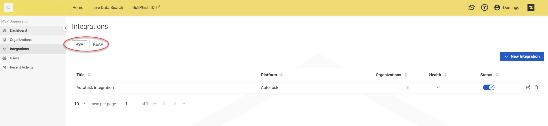 PSA tab: This tab displays all currently active PSA integrations. The columns shown are as follows: