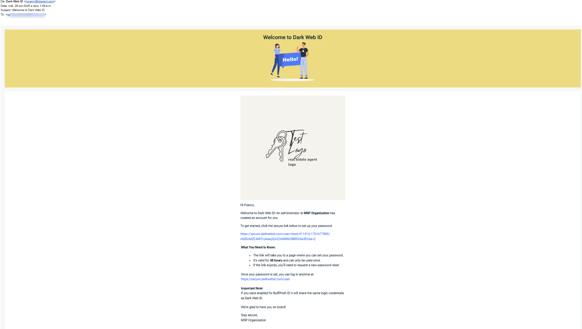 If your KaseyaOne account has already been set up, your Welcome to Dark Web ID email will appear somewhat distinct, as it will display two links: