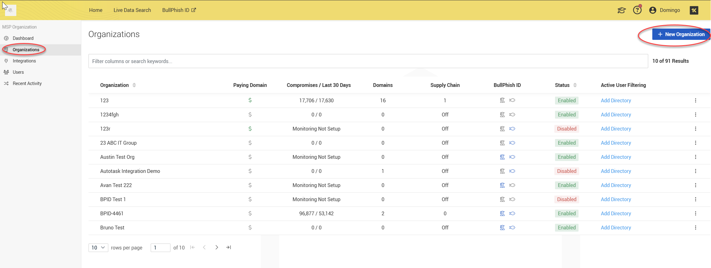 To manually add a new organization, click the + New Organization button in the upper-right corner.