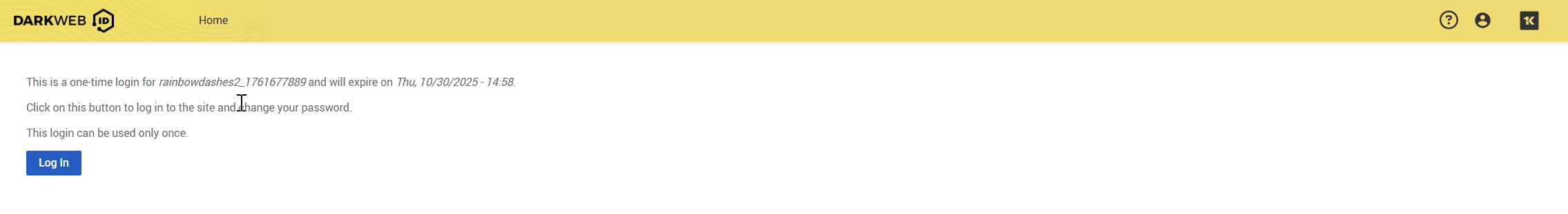 Upon clicking the link provided in the email, you will be directed to your first Dark Web ID platform screen. Click Log In to proceed.