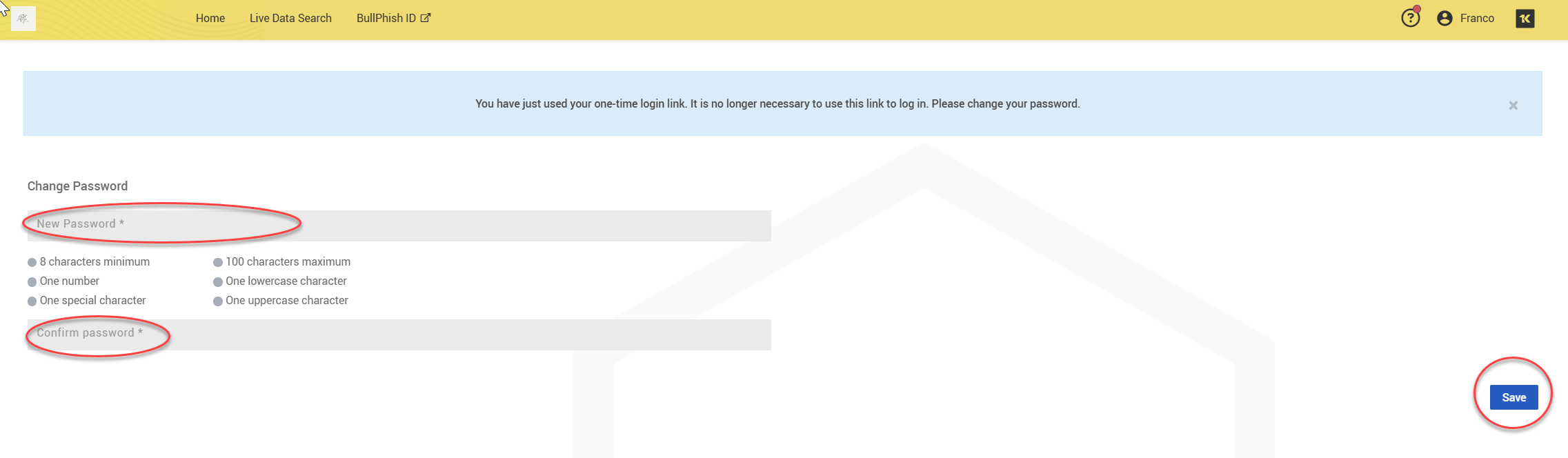 Type a password in the New Password field following the listed requirements. Then, retype your new password in the Confirm Password field and click Save.