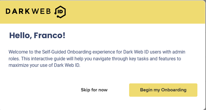 You can choose to complete it immediately or skip it for later. To learn more about this process, refer to Accessing the self-guided onboarding feature.