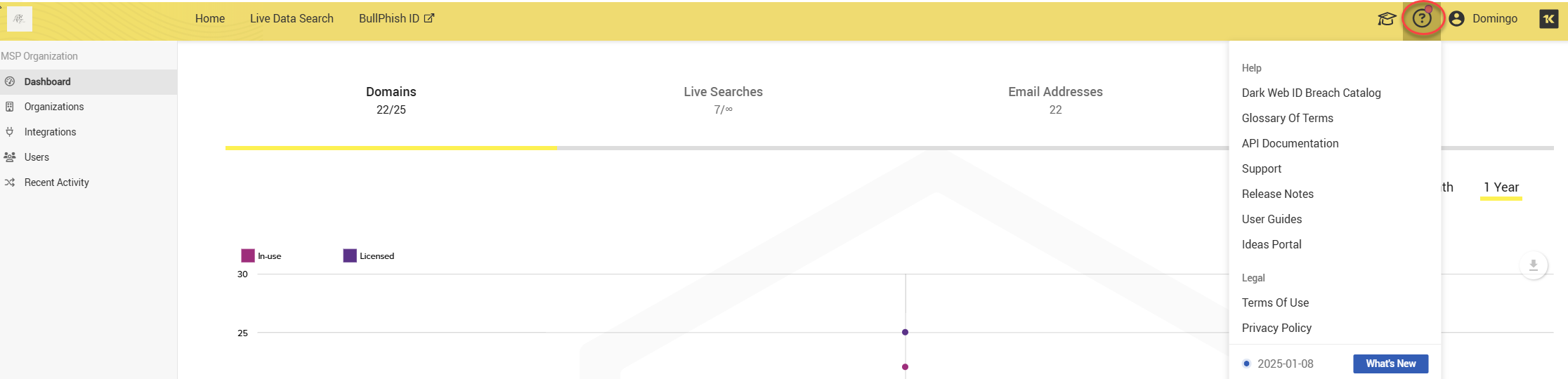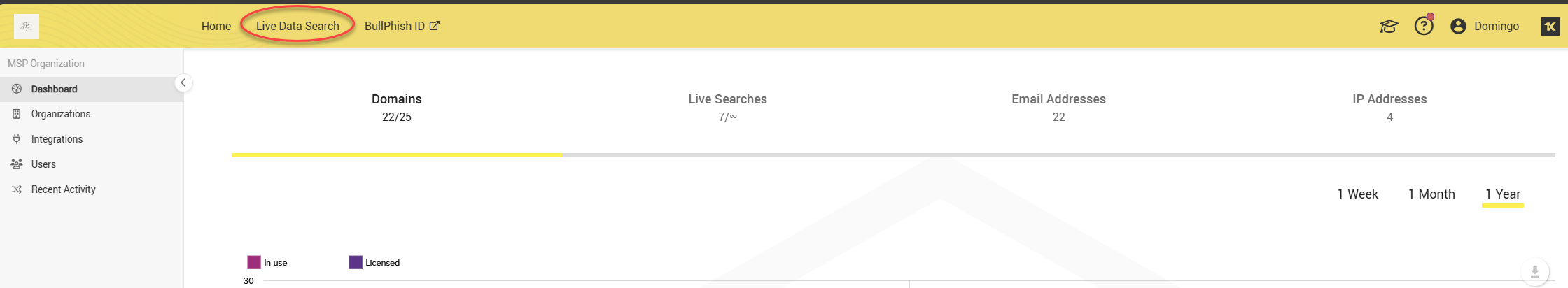 The Dashboard provides visibility into domains, live searches, email addresses, and IP addresses. You can track the number of domains, live searches conducted, and emails and IPs that were searched for compromises.