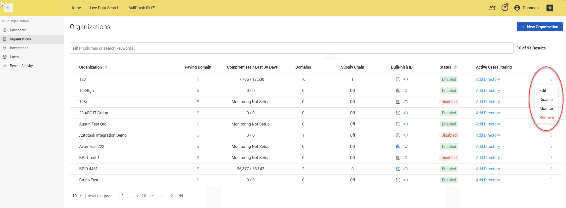 Organizations may be edited, disabled, monitored, or removed through the More menu located on the right side of each organization entry.