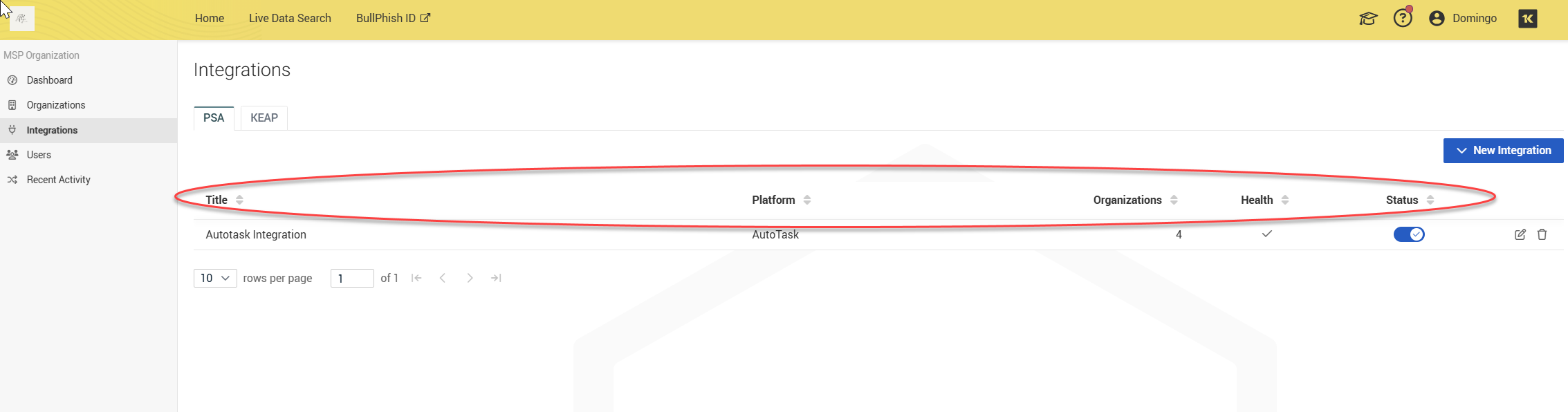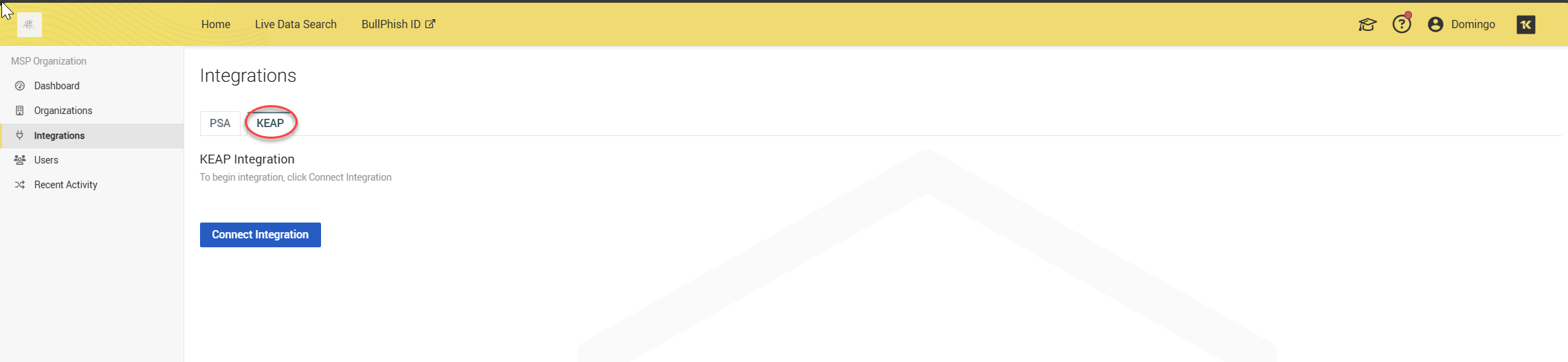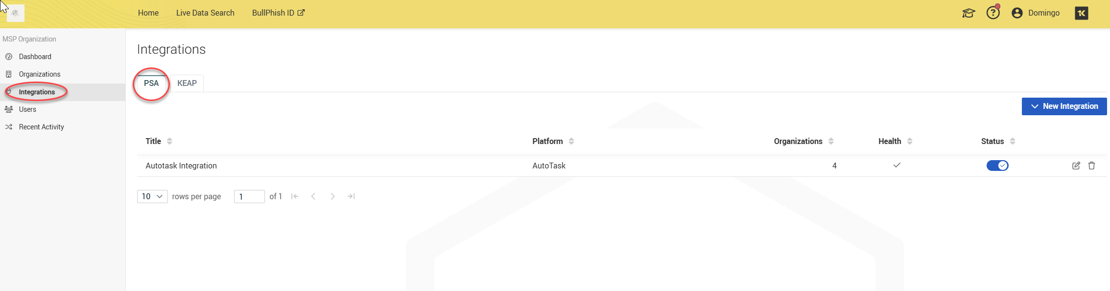 The Integrations page allows you to integrate your PSA, such as Autotask, BMS, ConnectWise to sync organizations with Dark Web ID.