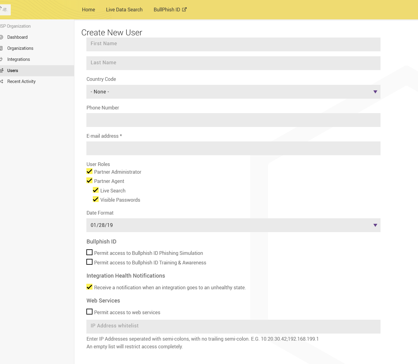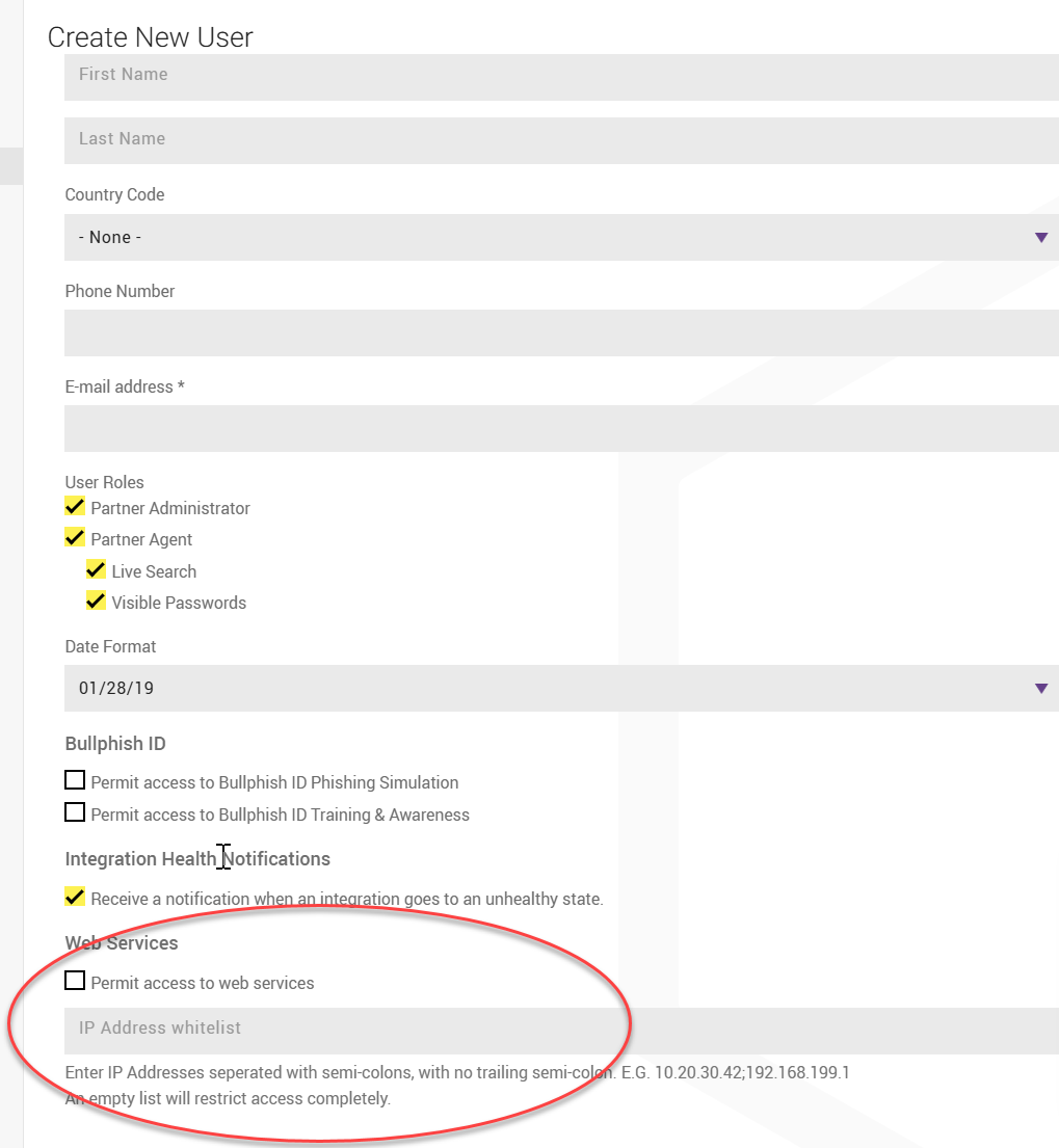 5. If the user requires access to the Dark Web ID API, select the checkbox and enter the IP address from which the user will make API calls.