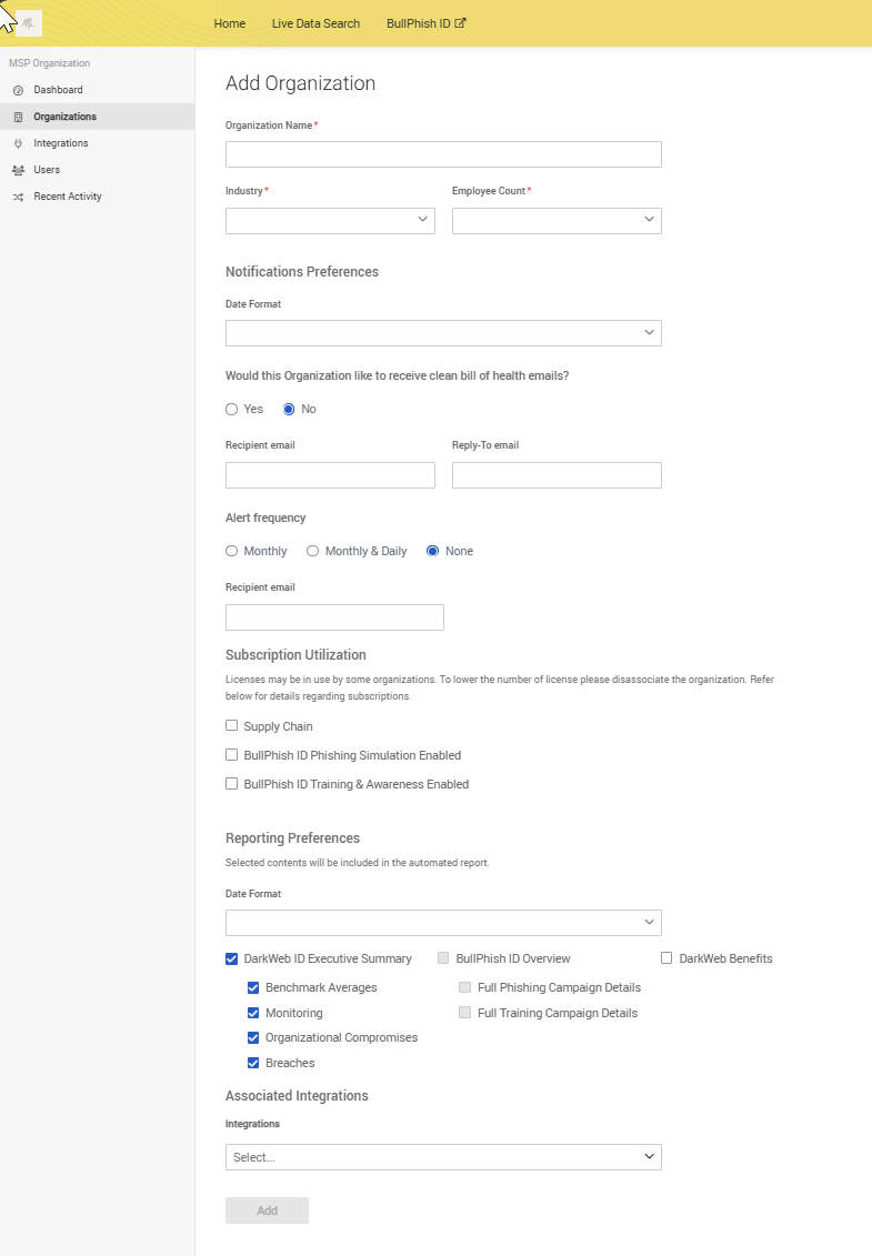 Next, enter the organization's name, industry, and employee count. You also have the option to set notification preferences, subscription utilization, reporting preferences, and associated integrations. This functionality allows for easy management of organizations that are not synced through integrations.