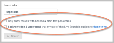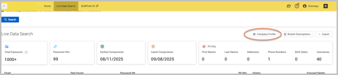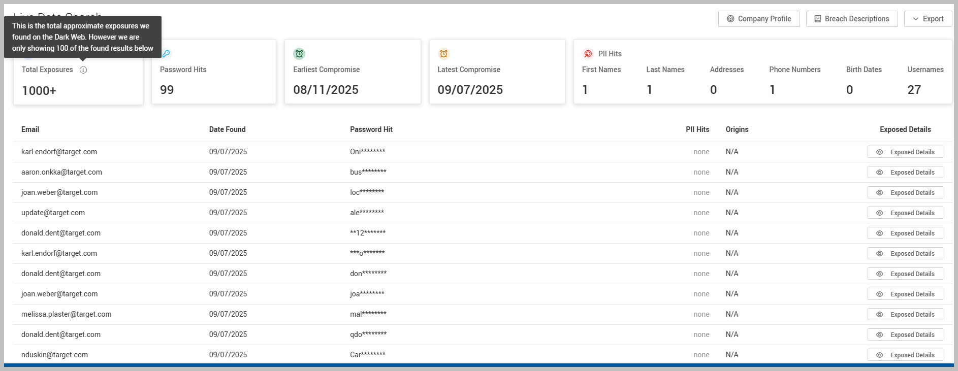 The Live Search tool generates a sample dataset comprising the 100 most recent records from the past 24 months. In compliance with current privacy laws, the tool will display only the first four characters of any exposed password (e.g., Pass********). Users can access the full password only after beginning to track a domain under the Organizations tab.