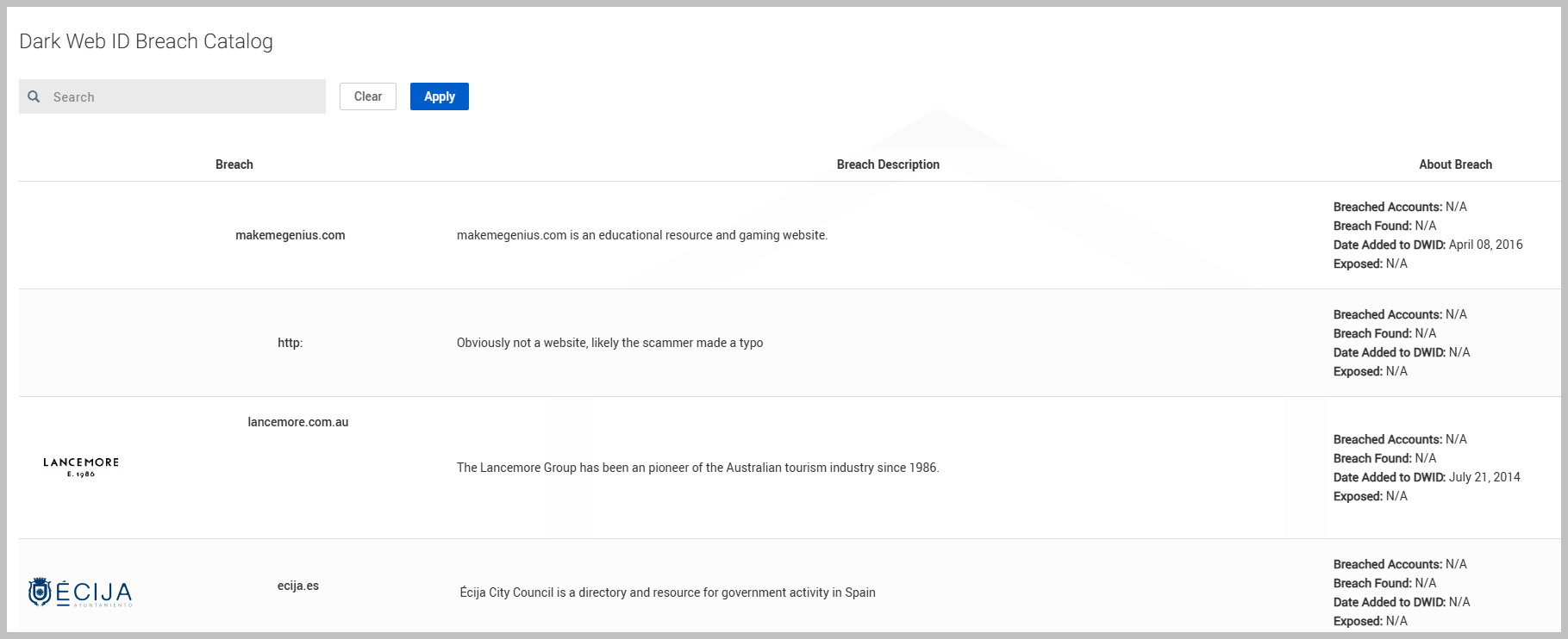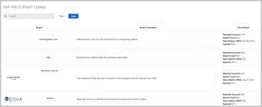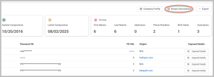 Clicking Breach Descriptions provides you with a comprehensive report detailing the data breaches that included the monitored information. The report encompasses information such as the following: