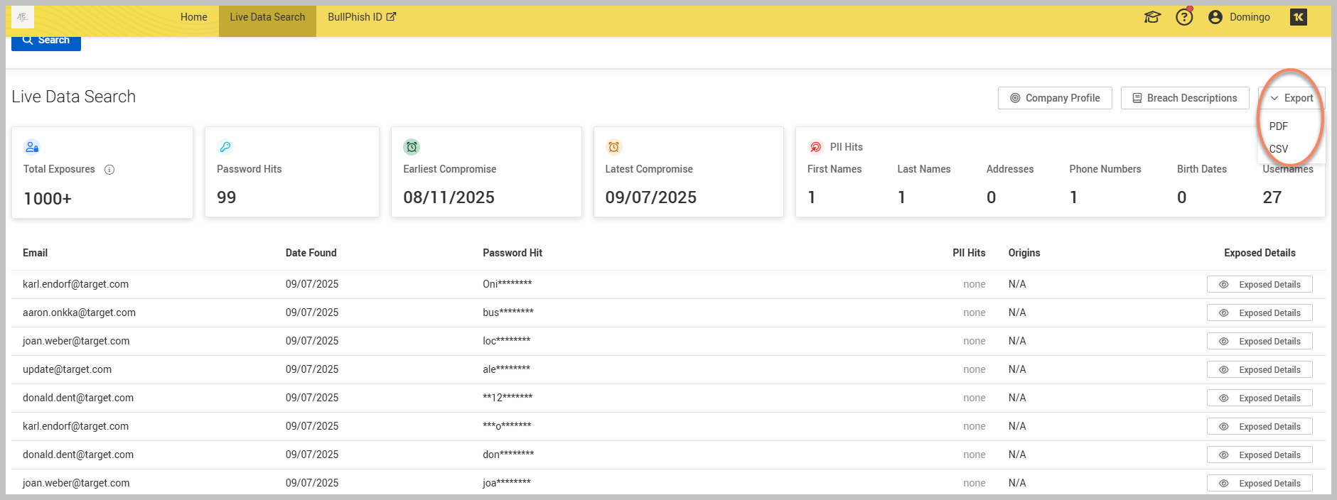 You can export all gathered data using the Export CSV and Export PDF options located in the upper-right corner of the interface. This feature is useful for saving the information for later review or for record-keeping. The exported results will provide as much attribution as possible, revealing additional personal information that may have been leaked onto the dark web, including related emails and passwords.