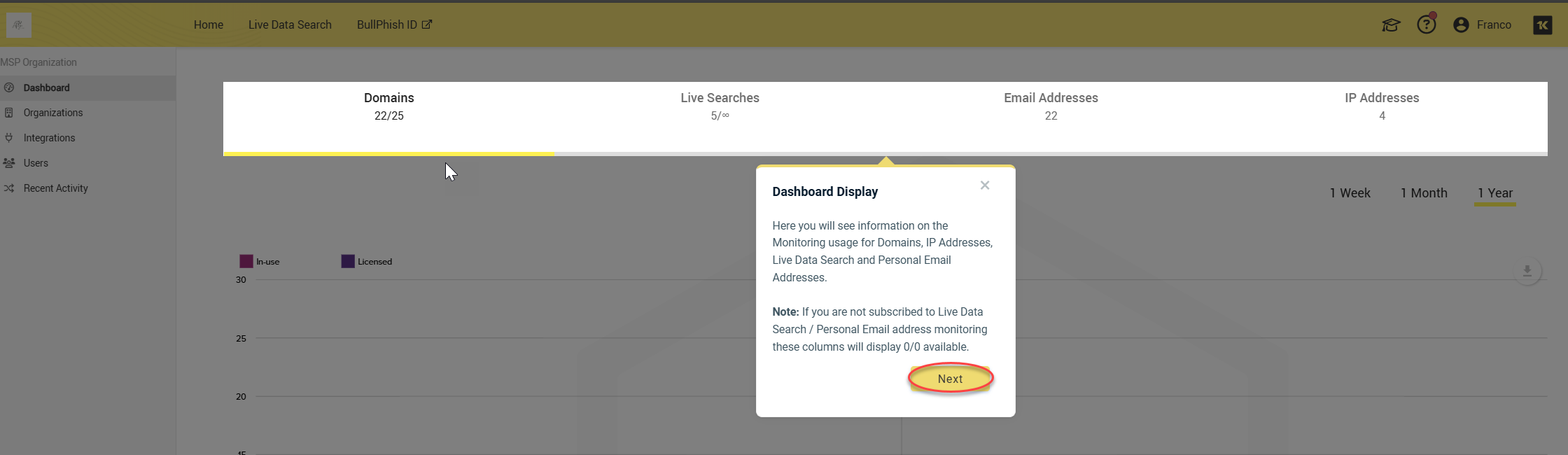 The self-guided onboarding feature provides on-demand interactive help and introduces users to crucial Dark Web ID features and how to use them through pop-up menus.