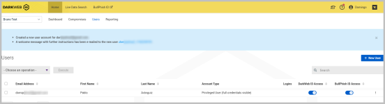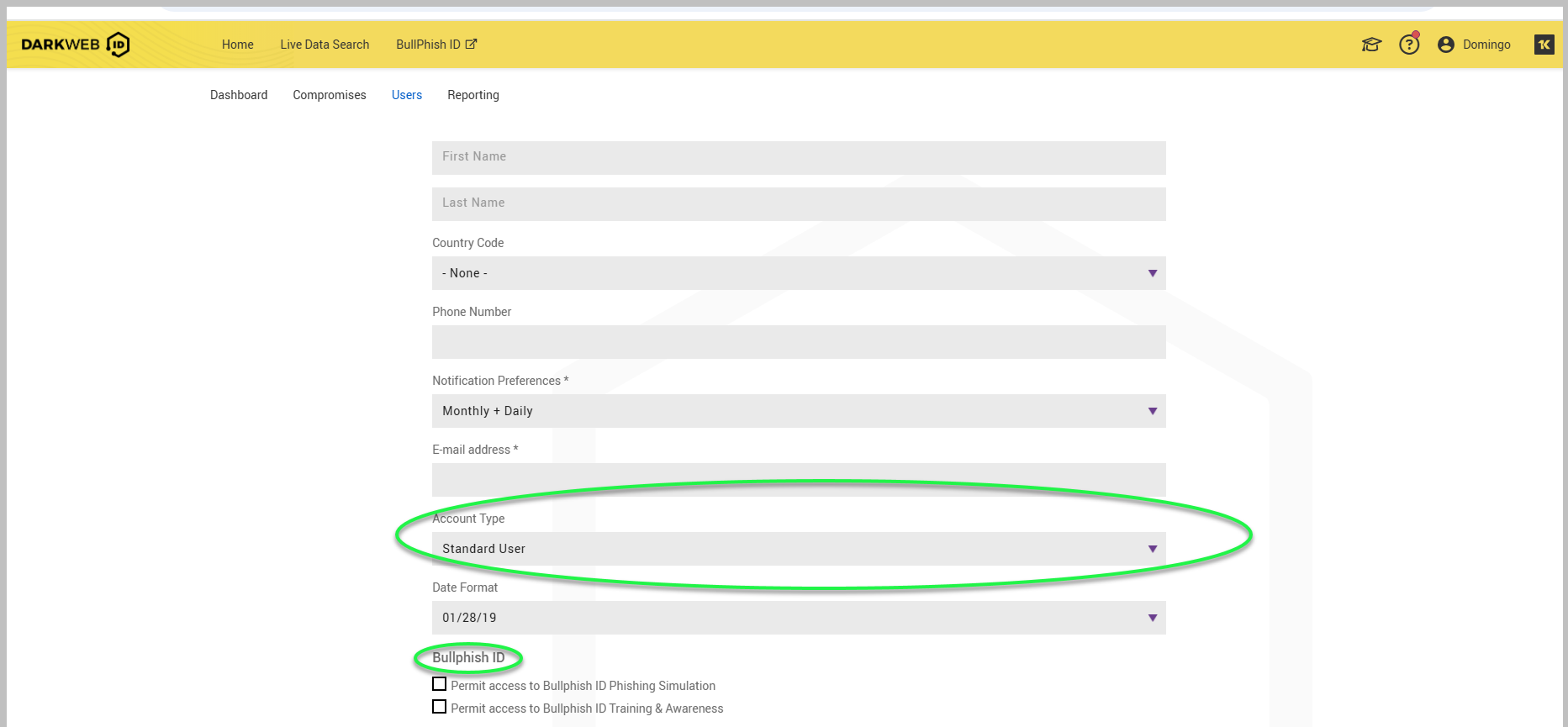 Enter the required information for the user. In Account Type, you can choose whether the user is a Standard User or a Privileged User (with full credentials visible). You can also grant access BullPhish ID phishing simulations and training and awareness under BullPhish ID.