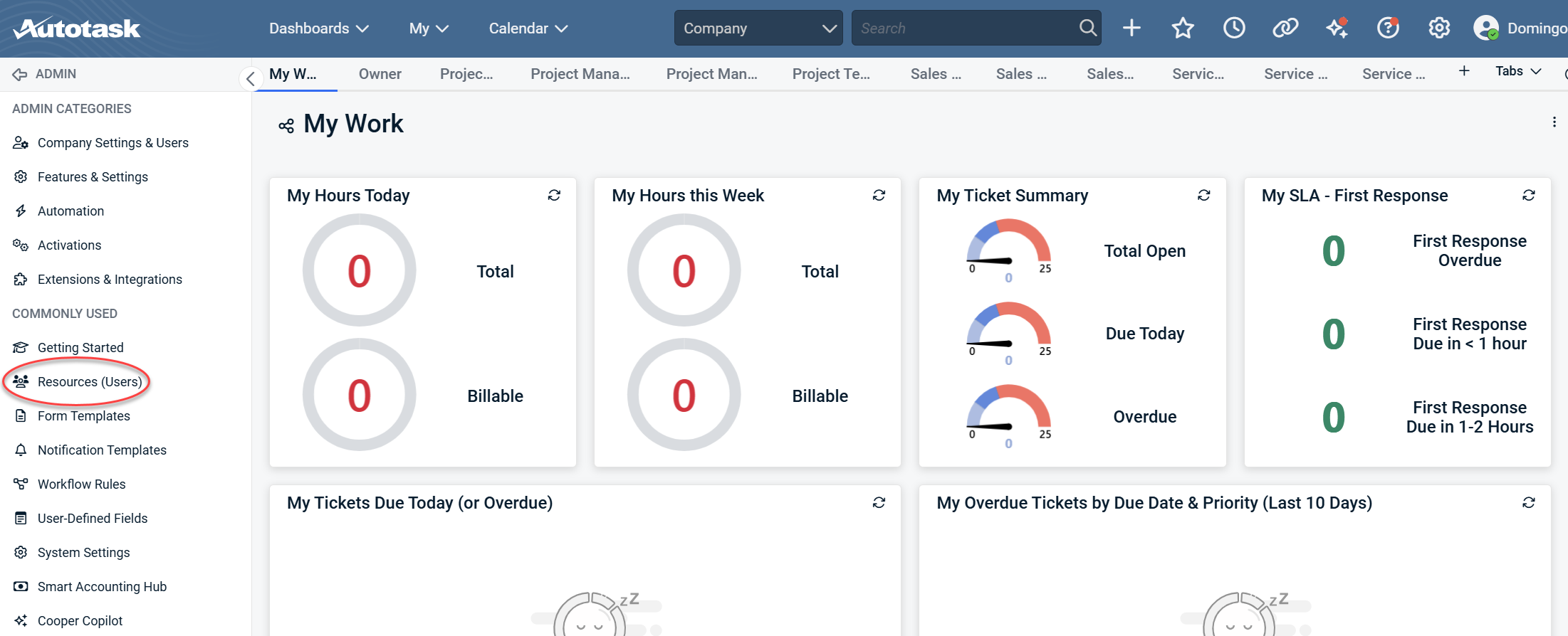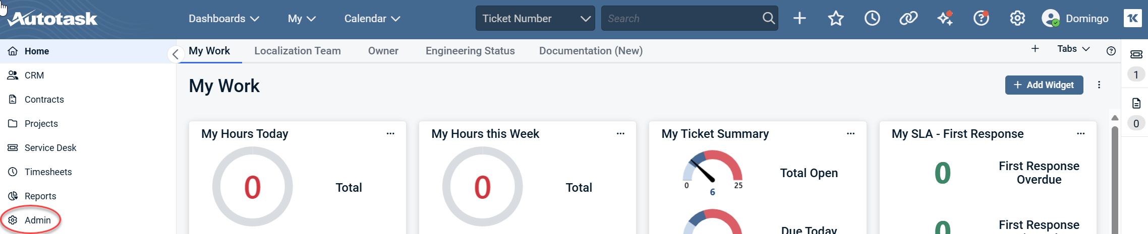 1. From the Autotask dashboard, navigate to the Admin section in the left menu.