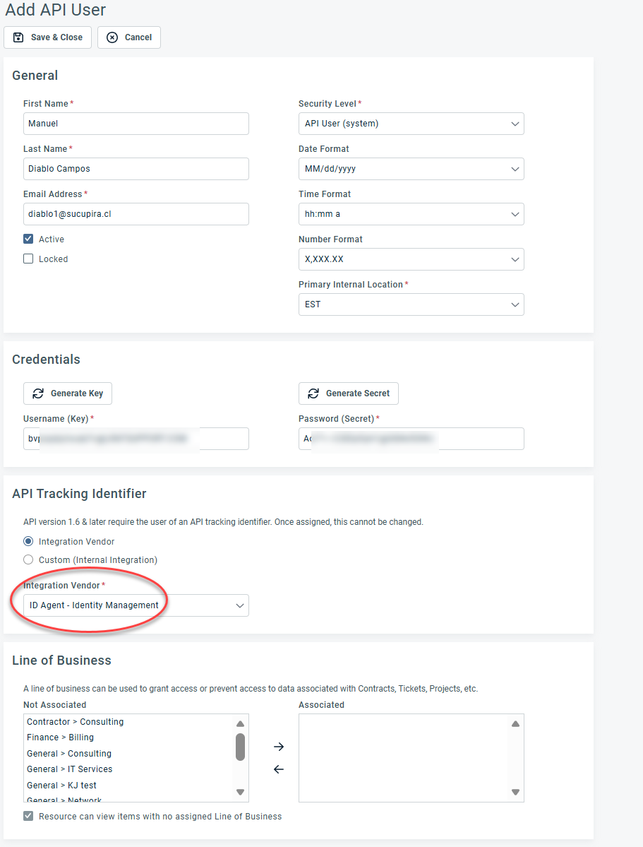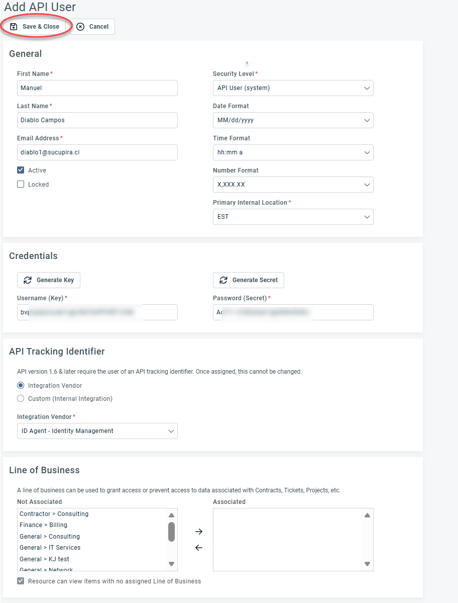 7. Click Save & Close. This will add a new API user to the application