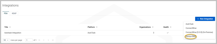 3. Click New Integration under the PSA tab to define your ticketing integration.