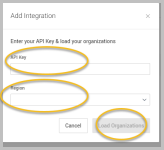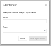 To begin integration, enter the API Key and Region in the modal window and click Load Organizations.