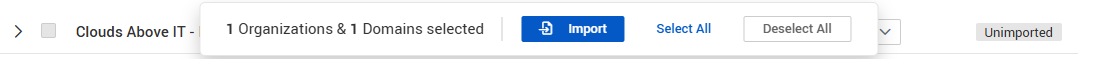 In the lower-right corner, a message will appear stating the following: Import has been started. Please allow up to 10 minutes to import the selected organizations and domains. Do not close this page while tracking the import status.
