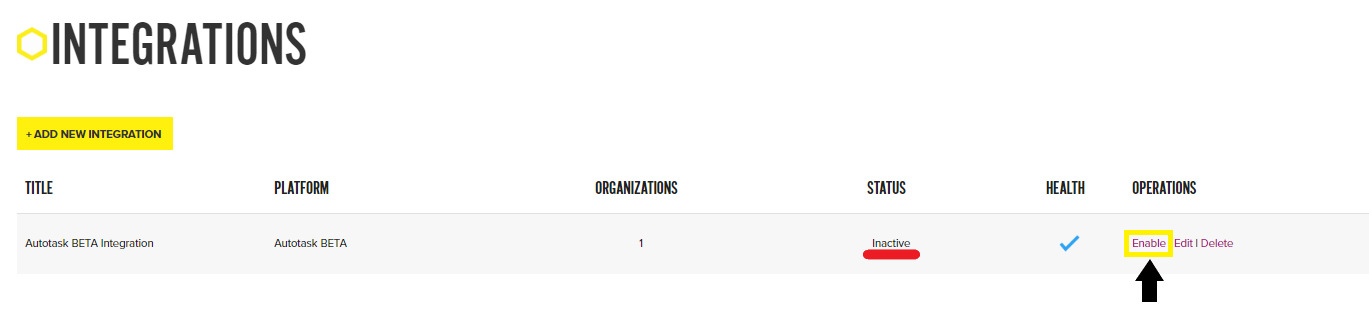 - Check whether the integration is enabled under Integrations -> Operations -> Enable at the far right.