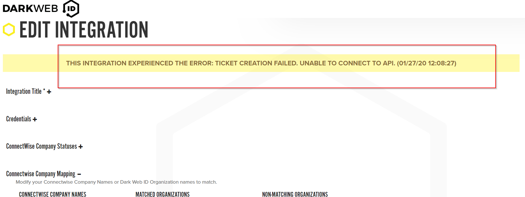 We have received some alerts for compromises but tickets were not generated in our PSA. When we try to edit the API integration we saw this error