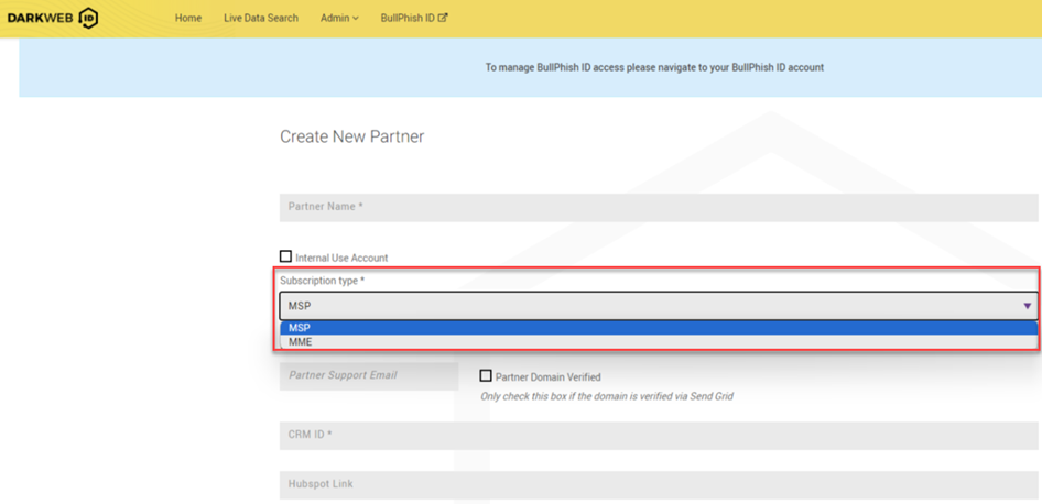 A new Subscription type field has been added to the Create New Partner page. It enables you to indicate MSP or MME as the subscription type for the new organization you are creating. MSP is selected by default.