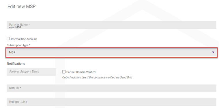 Viewing the edit page shows that MSP is selected in the Subscription type field.