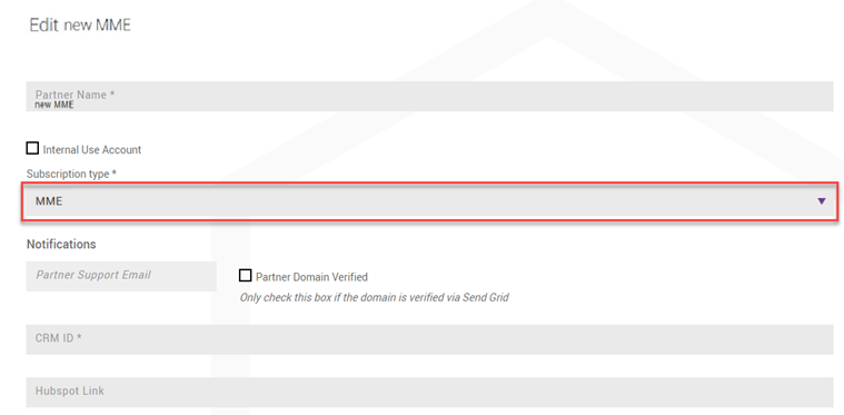 Viewing the edit page shows that MME is selected in the Subscription type field.