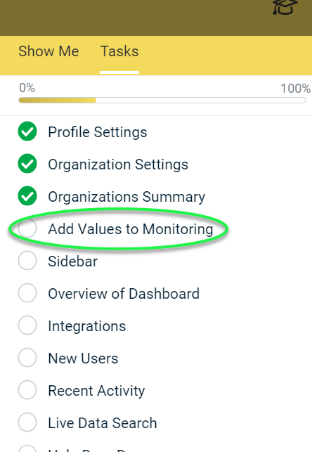 A new Add Values to Monitoring onboarding task is now available in the Tasks tab when you click the graduation cap onboarding icon in the upper navigation menu.