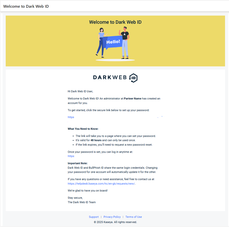 New welcome email templates have been created to enhance communication with new users, whether they are standalone users or already have a Kaseya One account. Our new welcome emails feature a more sophisticated design and provide more detailed information compared to our previous templates. Importantly, they include a reminder that Dark Web ID and BullPhish ID use the same login credentials. With these enhancements, we are committed to delivering a positive first impression and facilitating a seamless onboarding experience.