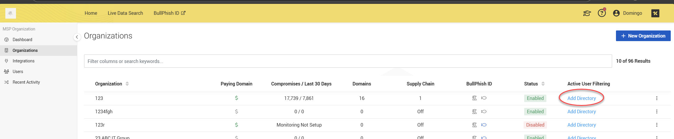 3. In the Active User Filtering column, for the applicable organization, click Add Directory.