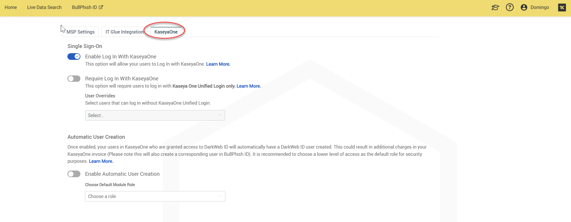 KaseyaOne: This tab allows you to enable your Kaseya Single Sign-on and enable automatic user creation.