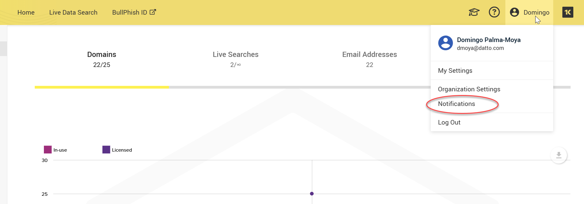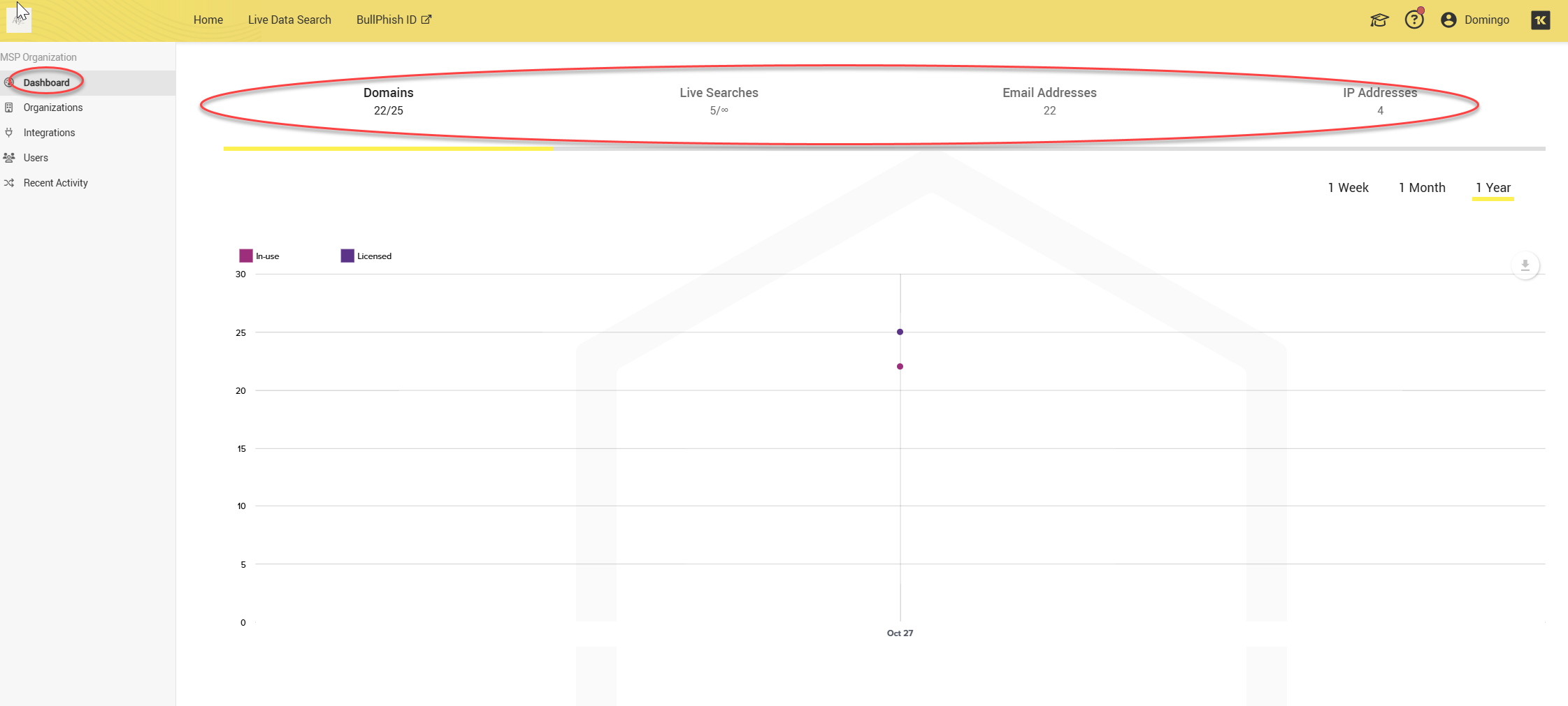 The Dashboard provides visibility into domains, live searches, email addresses, and IP addresses. You can track the number of domains, live searches conducted, and emails and IPs that were searched for compromises.