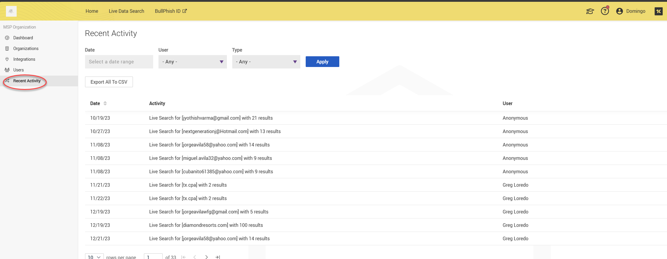 The Recent Activity page tracks user actions such as creating organizations, performing live searches, and removing domains or organizations. You can filter the results by date, user, or type of activity. Results can be exported in CSV format.