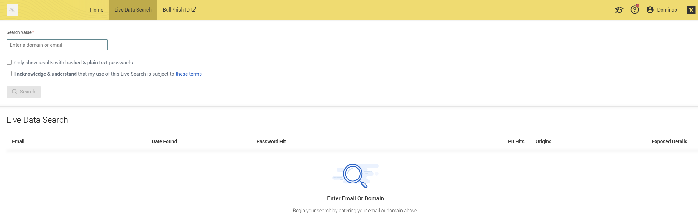 After entering a domain or email address, you can choose to display the results with either hashed passwords or plain text passwords, depending on your needs. You can also acknowledge and understand the use of live search.