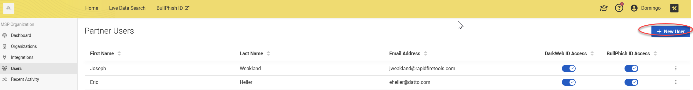 2. Click + New User in the upper-right corner.