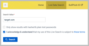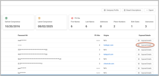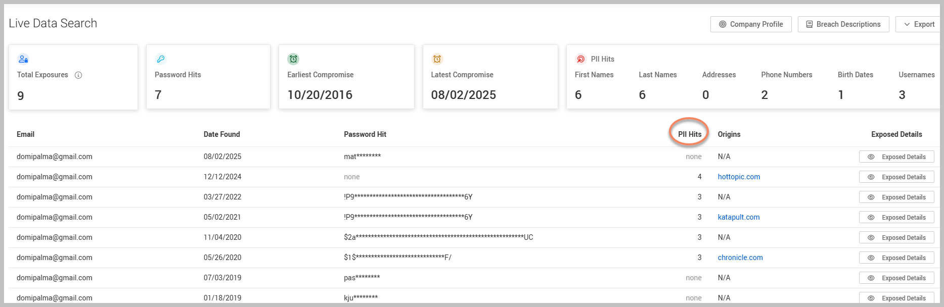 The Live Search tool generates a sample dataset comprising the 100 most recent records from the past 24 months. In compliance with current privacy laws, the tool will display only the first four characters of any exposed password (e.g., Pass********). Users can access the full password only after beginning to track a domain under the Organizations tab.