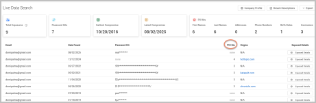 Another crucial column in the search results is labeled PII Hits, which stands for Personally Identifiable Information. When you see a PII Hit, it indicates that your personal information has been detected on the dark web due to a data breach. This exposure poses a serious risk, as cybercriminals may access sensitive information such as your name, address, phone number, and email address. Such details can facilitate identity theft, financial fraud, and unauthorized access to your online accounts. This information is considered PII because it can be used to uniquely identify you as an individual.