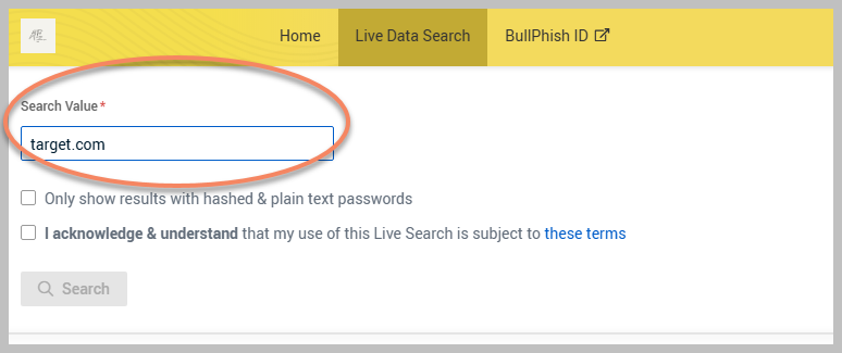 In the Search Value field, enter a domain name or an email address you wish to investigate. For example, you might input target.com or jdoe@bestbuy.com