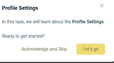 In addition to finalizing the onboarding for the specified task, Acknowledge and Skip also prompts you to move forward with the subsequent onboarding tasks. Click Let's go to advance to the next self-guided onboarding task.