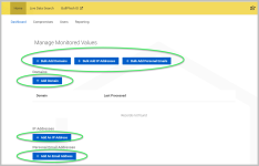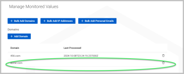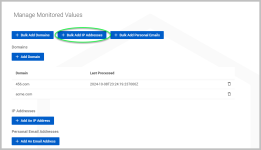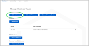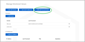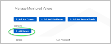 The Manage Monitored Values page will be displayed. Here, you can select + Add Domain, + Add An IP Address, or + Add An Email Address, depending on what you wish to monitor. You can add domains, IP addresses, or email addresses in bulk by clicking + Bulk Add Domains, + Bulk Add IP Addresses, or + Bulk Add Personal Emails, respectively.