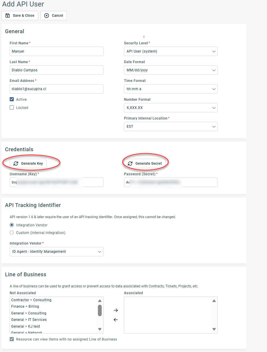 4. Fill out the required information for the new API user, ensuring that the Security Level is set to API User.