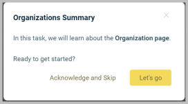 In addition to finalizing the onboarding for the specified task, Acknowledge and Skip also prompts you to move forward with the subsequent onboarding tasks. Click Let's go to advance to the next self-guided onboarding task.