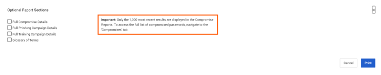 To address this concern, a limitation has been established on the number of compromises that may be included in these reports. Upon clicking the Print Report button within an SMB organization, users will now see an Important note indicating that only the 1,000 most recent results will be presented in the compromise reports.